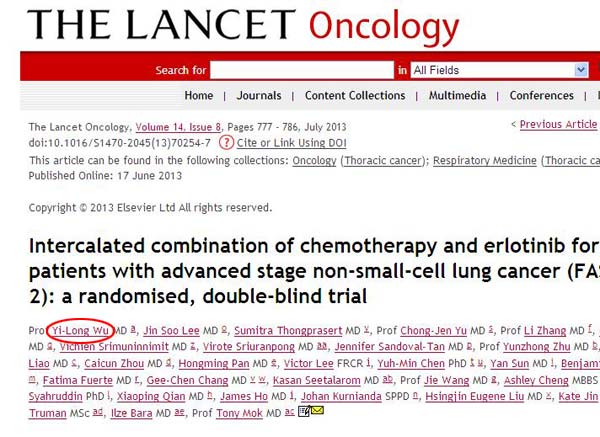 我院吴一龙教授近5年在Lancet和Lancet Oncology上发表学术论文6篇,其中第一作者2篇,从2009年起,连续被邀请为Lancet Oncology主办的亚洲肿瘤论坛做大会演讲嘉宾,在国际肺癌研究领域引起广泛关注。
