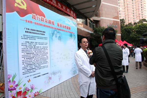 为进一步巩固和扩大党的群众路线教育实践活动成果,根据省委实践办的统一安排,12月26日统一举办“践行群众路线 服务百姓健康——全省第一批党的群众路线教育实践活动6家省属医院向社会公开服务承诺暨大型义诊活动”,我院作为全省第一批党的群众路线教育实践活动6家省级医院之一,承办省人民医院分场活动。