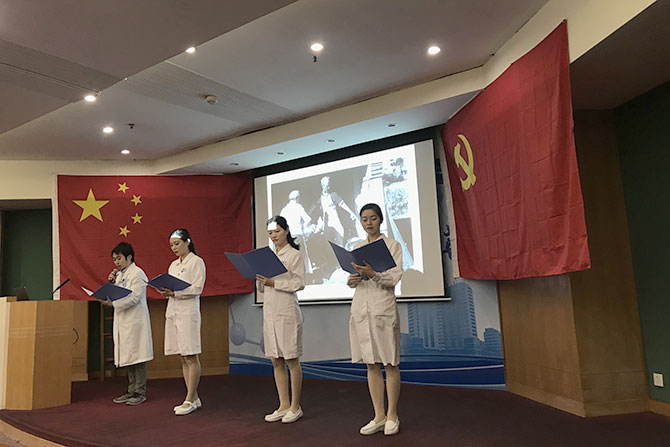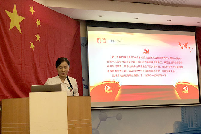 大会在四位年轻党员的慷慨激昂、声情并茂地朗诵《白求恩精神》中拉开了序幕。然后,由党支部委员王小霞主讲《党的十九届四中全会精神解读》的主题党课,让大家对党的十九届四中全会的内容和精神有了更深层次的认识,加深了我们坚定道路自信、理论自信、制度自信、文化自信,毫不犹豫地走中国特色社会主义现代化道路的决心。支部委员李艳艳还传达了近期党委学习文件精神及纪法讲堂等内容,警醒党员们要懂法守法,不要逾越法律的红线。接着,大家一起观看了视频《时代楷模——白求恩》。党员们对白求恩这位加拿大籍国际共产主义战士对中国革命所做的贡献和白求恩精神有了更具体、更感性和更深刻的认识,白求恩精神就是伟大的国际主义、共产主义精神;就是毫不利己、专门利人无私奉献的精神;就是对工作极端热忱、精益求精的精神。
