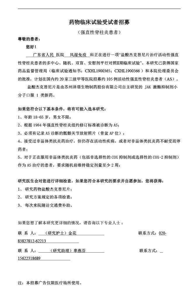 【招募】药物临床试验受试者(强直性脊柱炎患者)