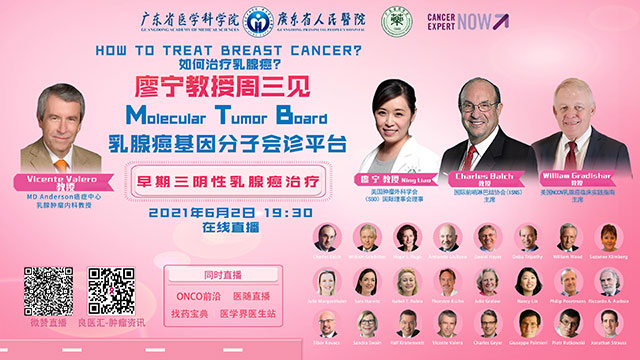 6月2日周三晚上7:30pm乳腺癌国际会诊,广东省人民医院外科乳腺科廖宁主任、美国NCCN 乳腺癌主席Gradishar 教授、美国ACSO CEO Balch教授共同主持,特邀美国MD Anderson癌症中心乳腺肿瘤内科副主任Vicente Valero讲授早期三阴性乳腺癌的治疗进展。