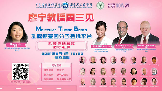 8月4日周三晚上7:30pm乳腺癌国际会诊,外科乳腺科廖宁主任、美国NCCN 乳腺癌主席Gradishar 教授、美国ACSO CEO Balch教授共同主持,对国内外疑难病例进行会诊。